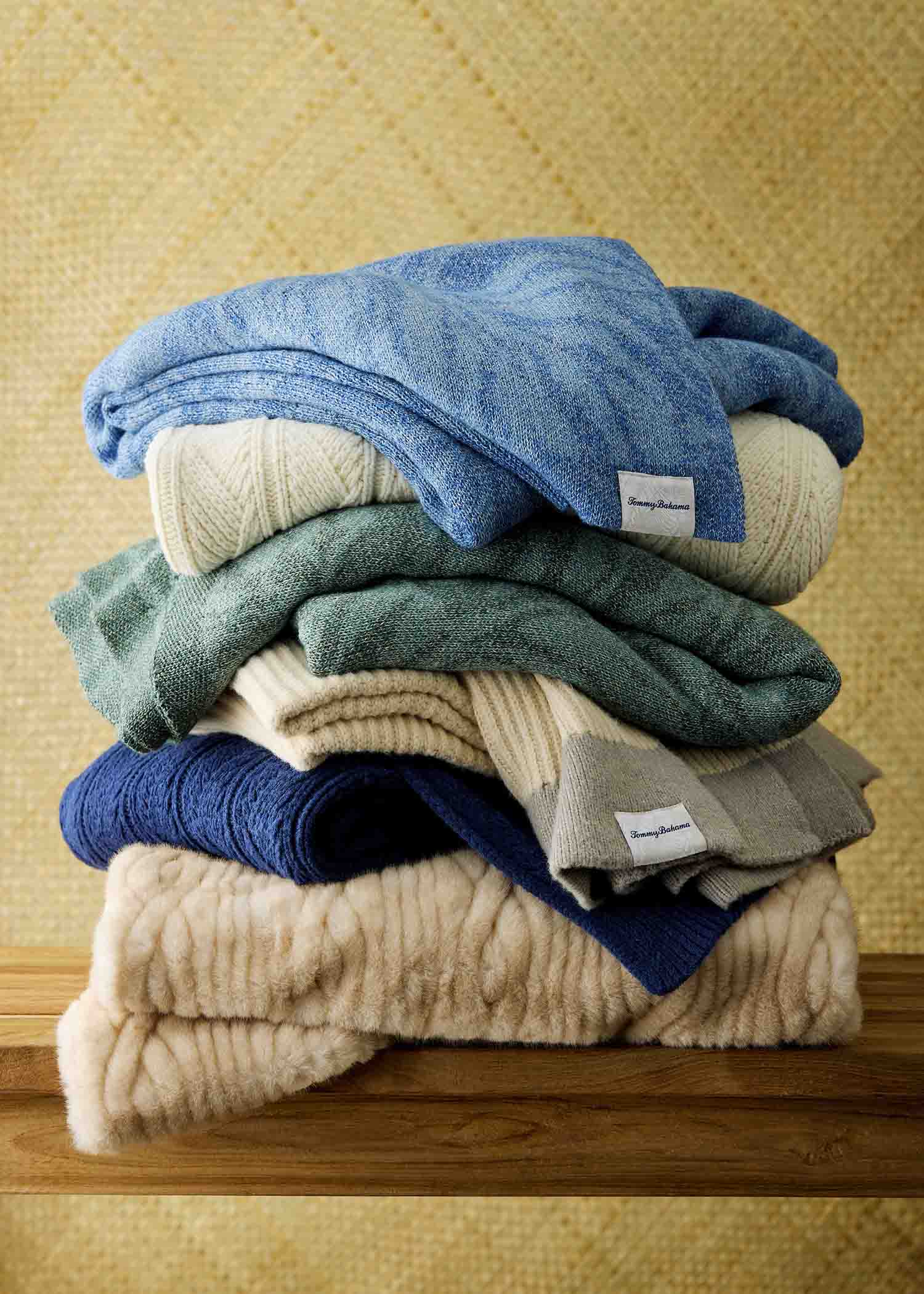 Cozy up this season with a throw that feels both elevated and comforting. Choose from three patterns — cable knit, Veracruz and Cayman Leaf fleece — and a range of colors, including beige, ivory, blue and green.
