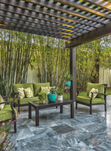 To give homeowners who live in the mountains part time a distinctly Floridian space at their Davis Islands property, the Argentine Group created a tropical getaway right in the home’s backyard with lush palm trees and greenery, colorful lighting, and a modern, resort-like pool deck. The true star of this outdoor upgrade is the rooftop terrace (above), specifically built with the elements in mind. Brazilian walnut (also called ipe) was chosen for both the flooring and the custom bar because of its supreme durability and insect resistance, while the synthetic turf, planted succulents and retractable awning hold up to Tampa’s intense sunlight and frequent storms. LED lighting and built-in audio complete the space.