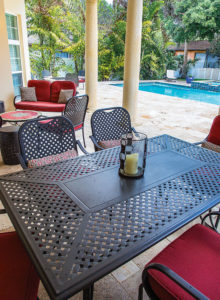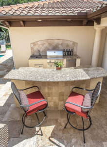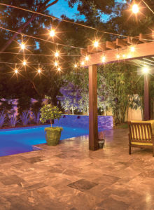 This Sunset Park home’s unusually large lot size gave Robert Sicignano and his team at FLA Pools plenty of room to turn what used to be just dirt and a trampoline into a multidimensional entertaining and living space. After raising the land and leveling it to prevent standing water, the team began work on the all-travertine lounge area, outdoor kitchen and pool deck. To make the Marquis Quartz-finished pool as simple to maintain and eco-friendly as possible, it features a salt chlorine generator that makes the pool’s chemicals and uses commercial floor returns, a technique that saves energy by allowing the chemicals and heat to come from the bottom of the pool — the coldest part — and rise. A propane system heats the pool, grill and fire pit and is controlled, like the lights and sound system, by an app on the homeowners’ phones.