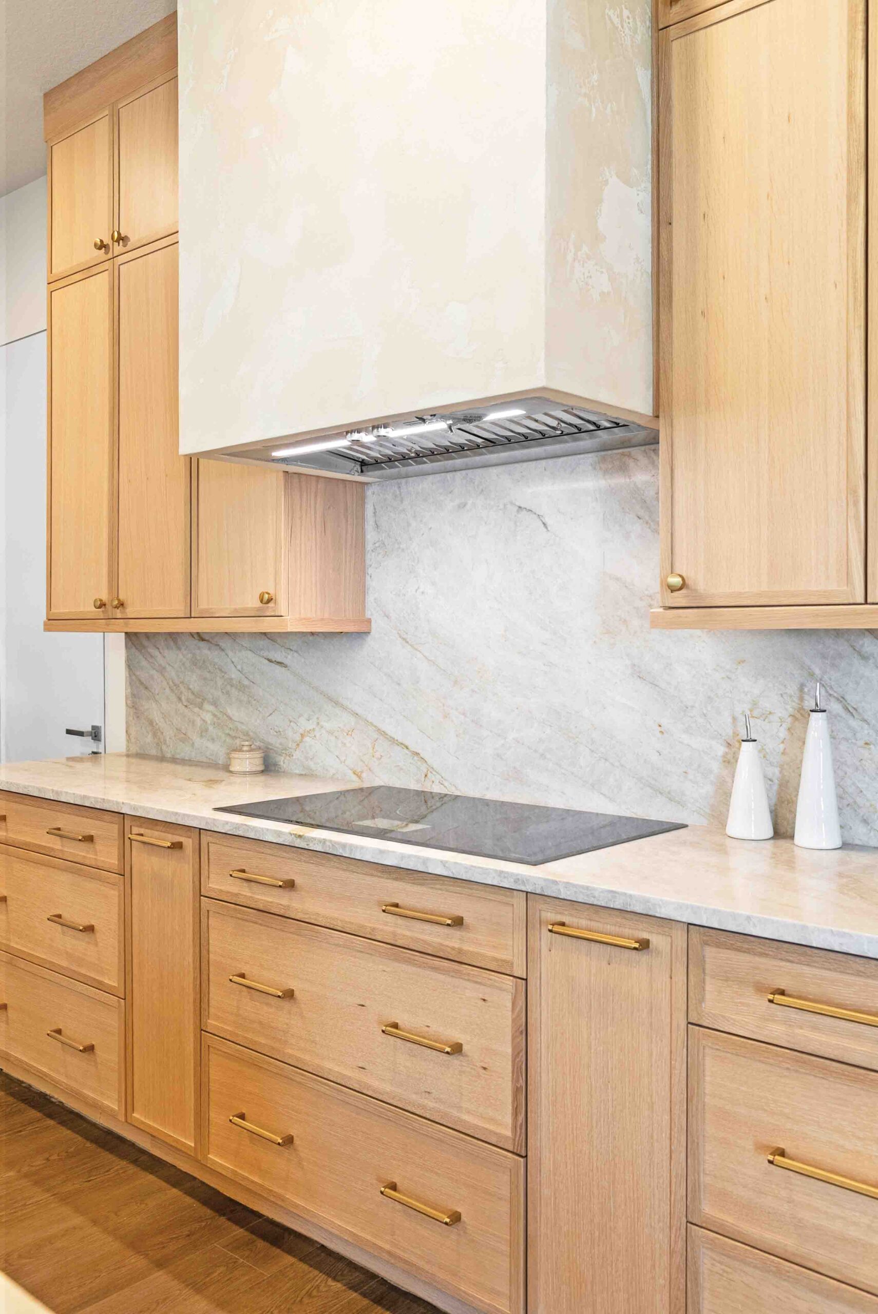 Inspired by natural elements—warm wood tones, organic textures and layered neutrals—the design centers on mid-tone oak cabinetry for richness, paired with creamy stone countertops and a full-height slab backsplash accented in brass and gold. A custom plaster range hood, handcrafted by artist Ron Francis, introduces sculptural texture and a one-of-a-kind touch, as he makes each hood entirely by hand, ensuring no two designs are alike. Reeded wood detailing on the island adds warmth, while integrated appliances and pop-up outlets keep the look clean and functional.