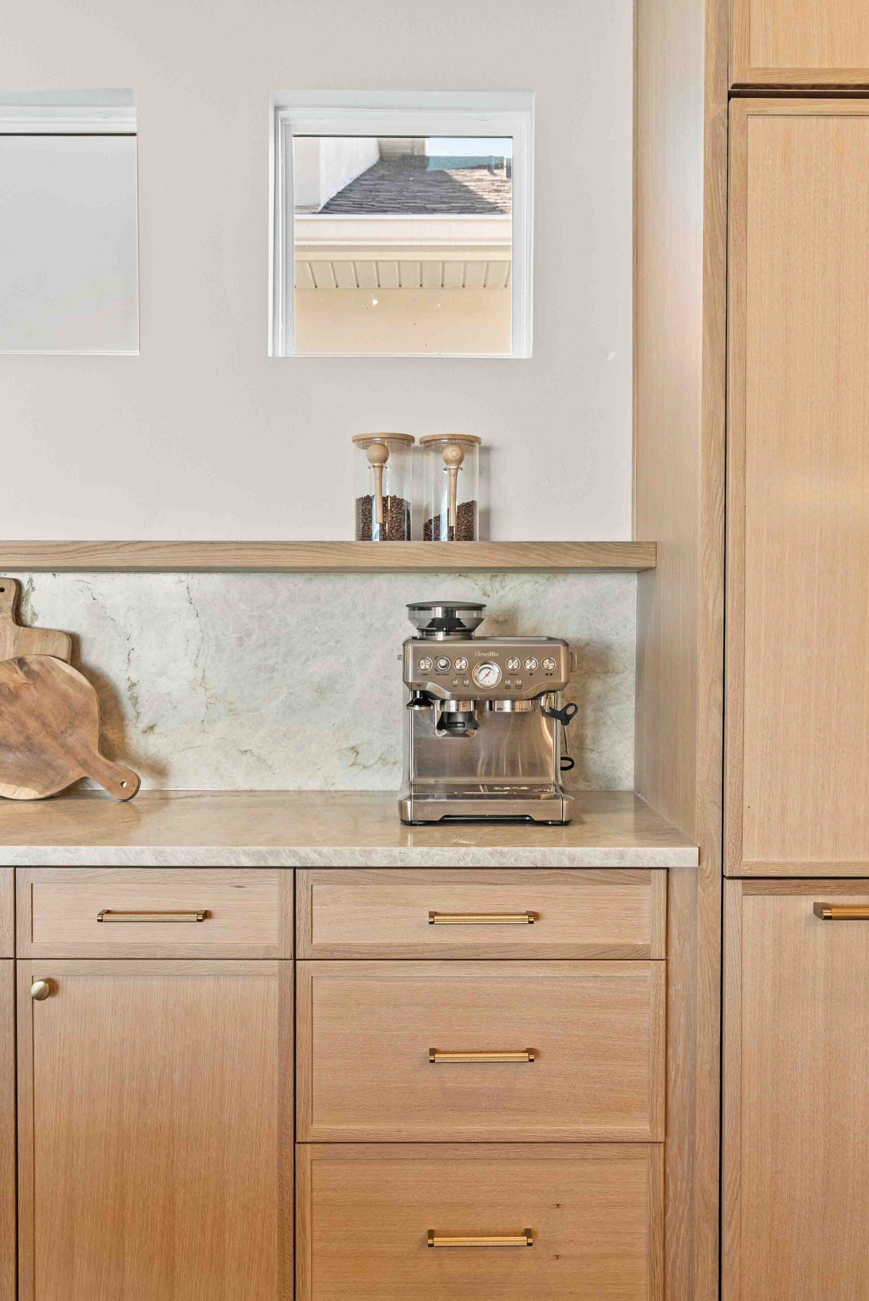 A built-in coffee bar—complete with open shelving and dedicated storage—was a must-have. It’s ideal for the couple’s morning routines and entertaining friends, serving as a stylish yet practical focal point.