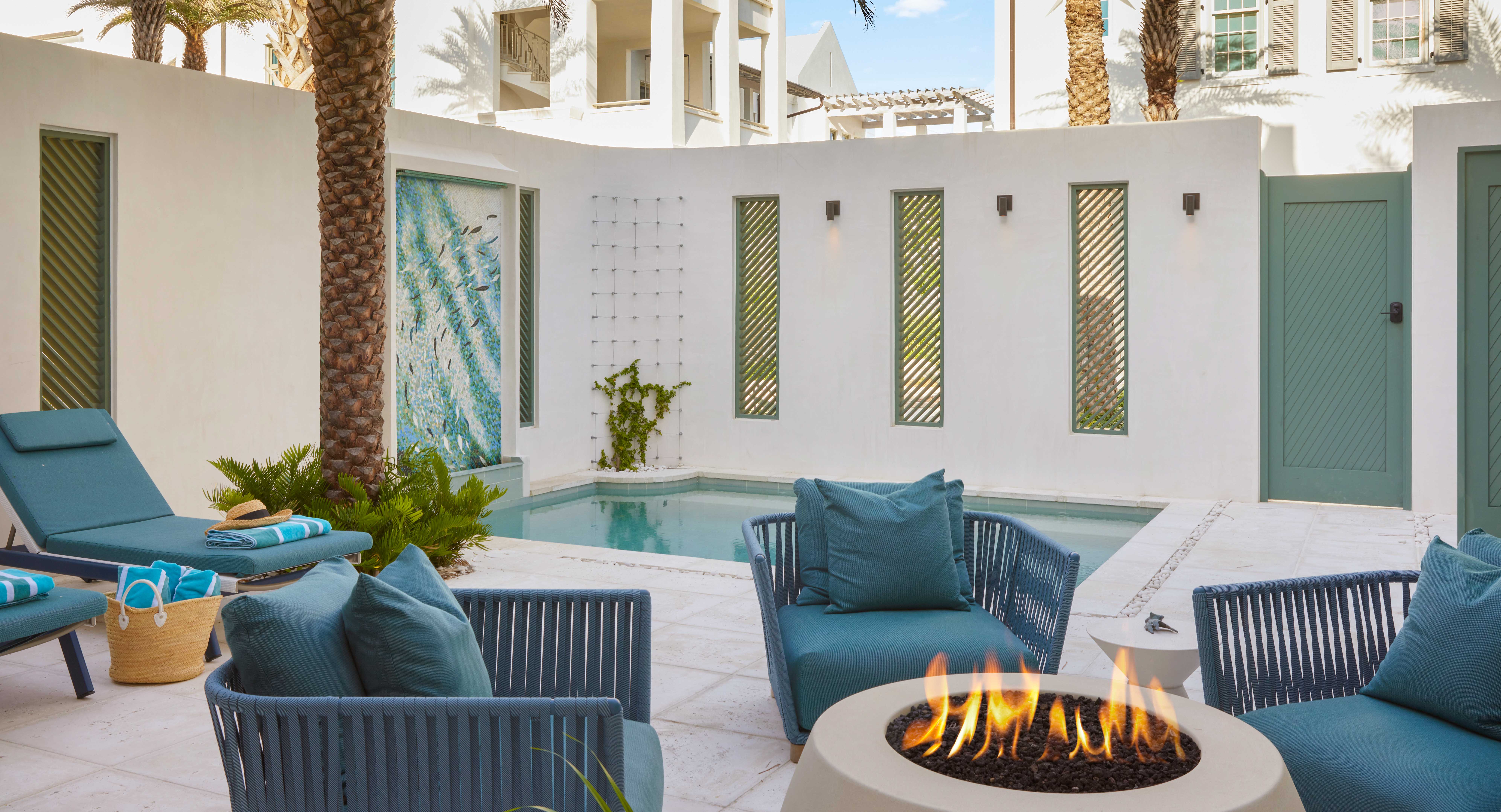 The outdoor area continues the coastal palette with teal-accented furniture, a mosaic-tiled splash pool, and copper wall lights—bringing a sense of whimsy and continuity to this thoughtfully designed retreat.