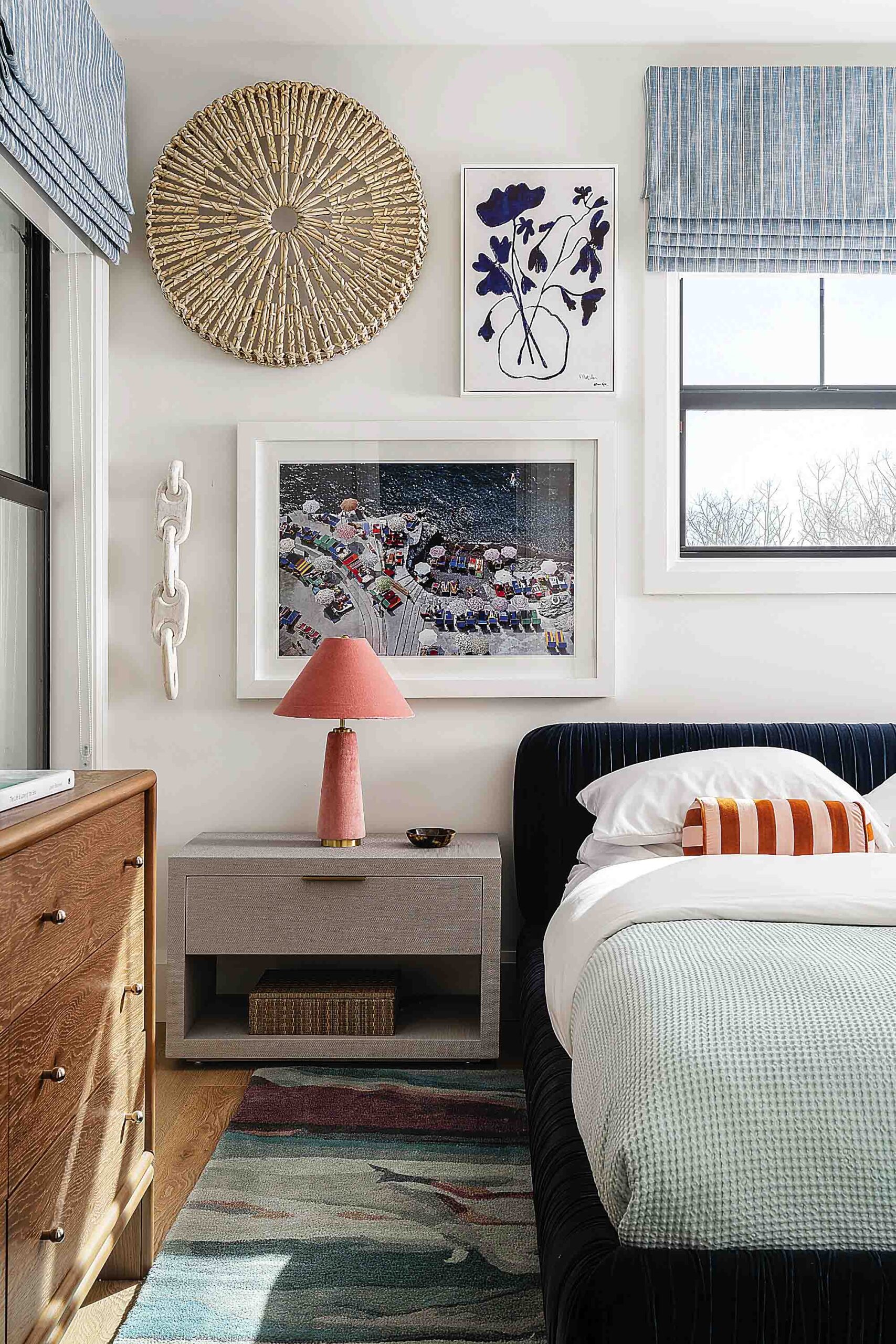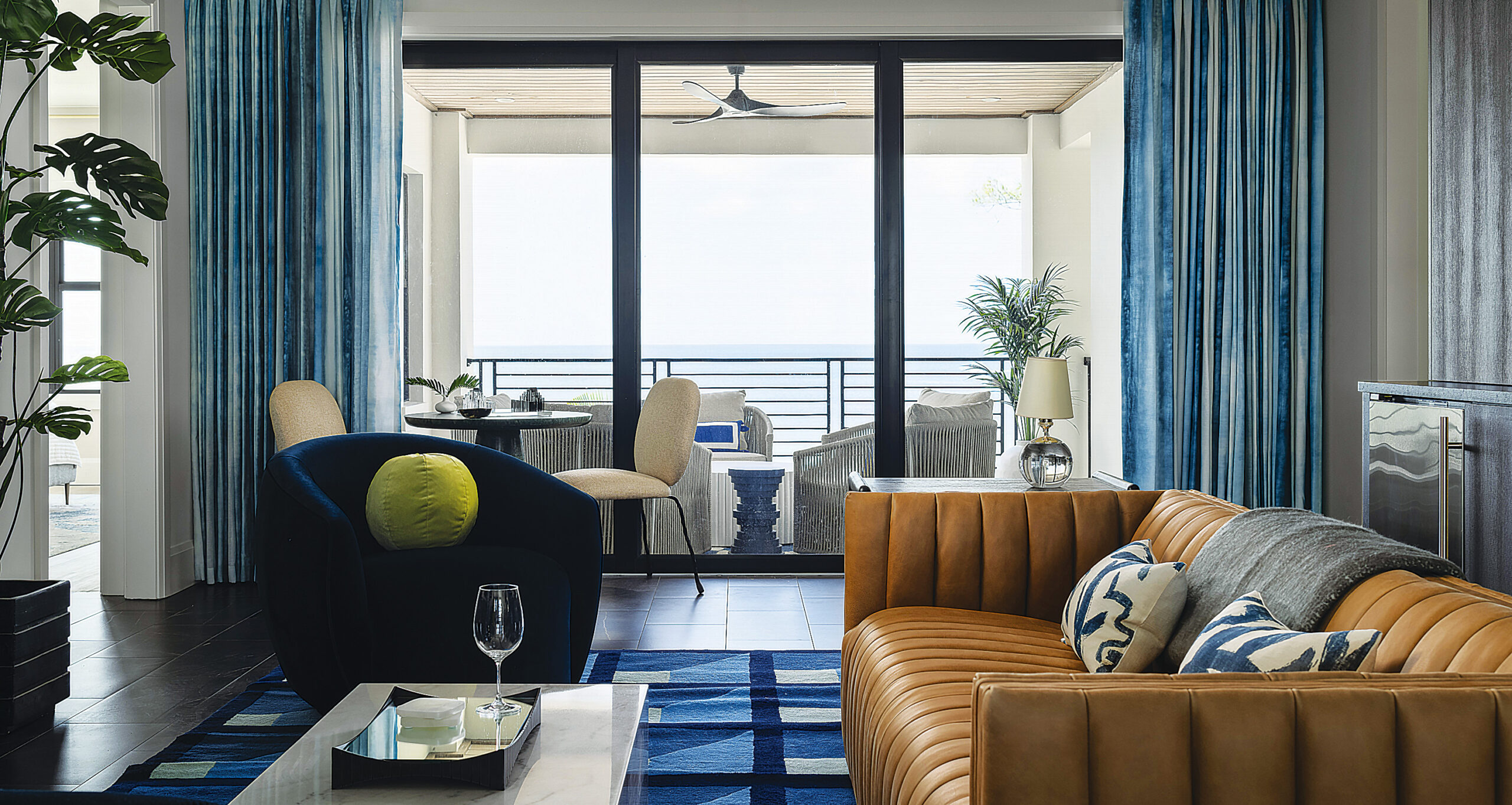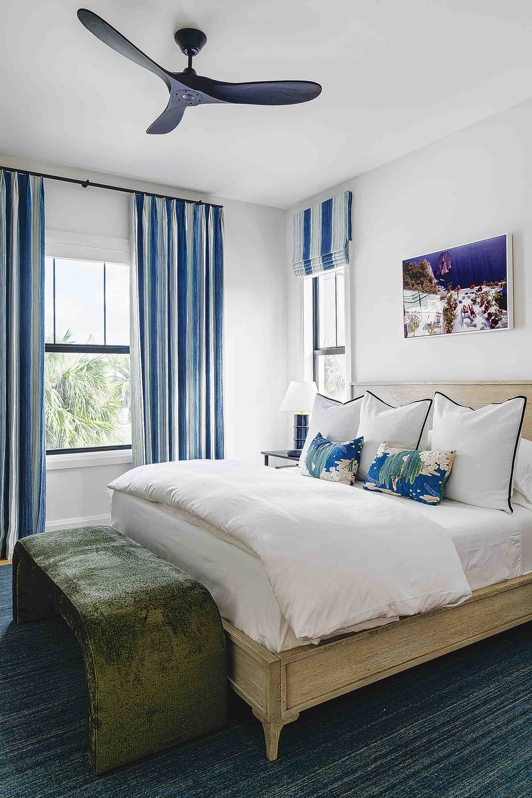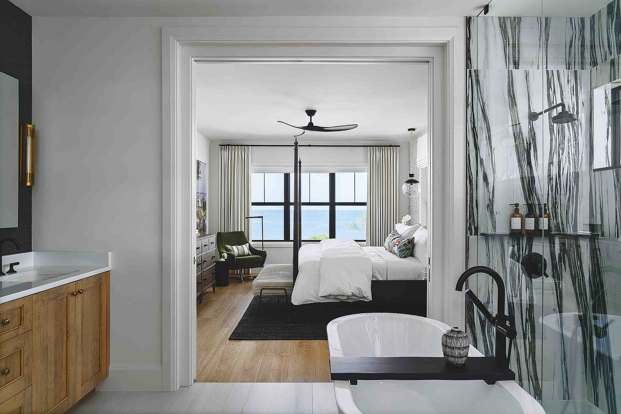 Throughout the home, bold yet balanced color choices create a lively coastal energy—while designer wallcoverings including grasscloth, tropical botanicals, geometric patterns and wave-inspired prints add personality to every room.