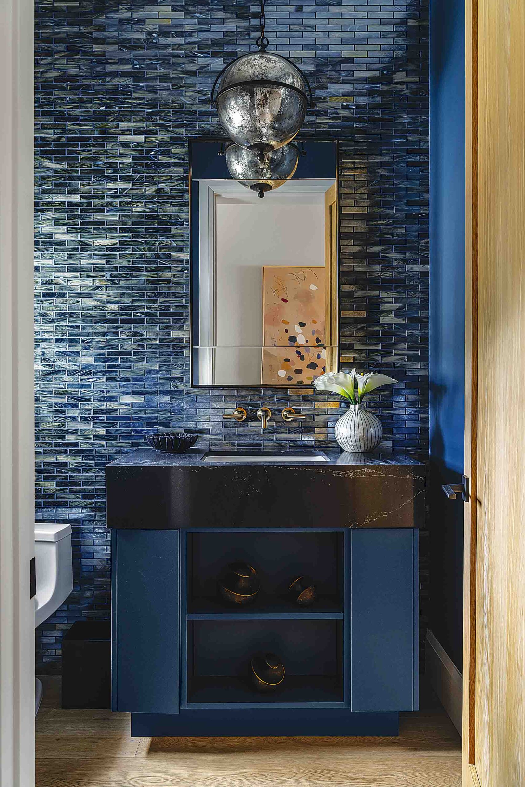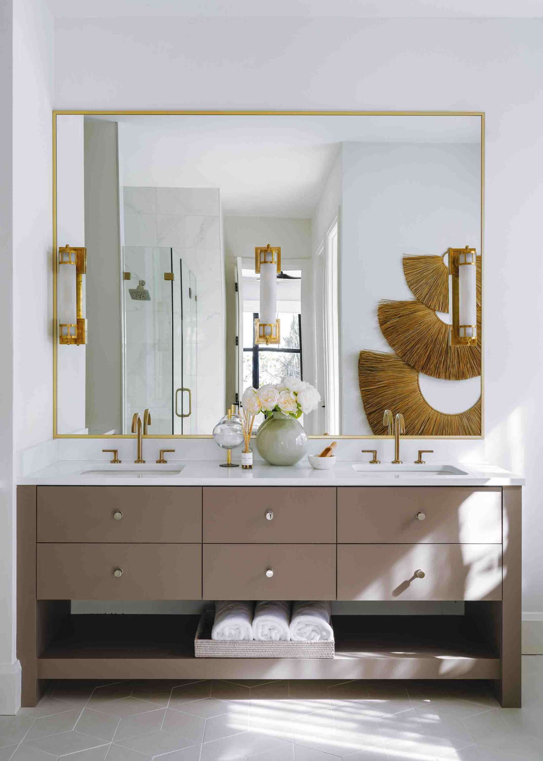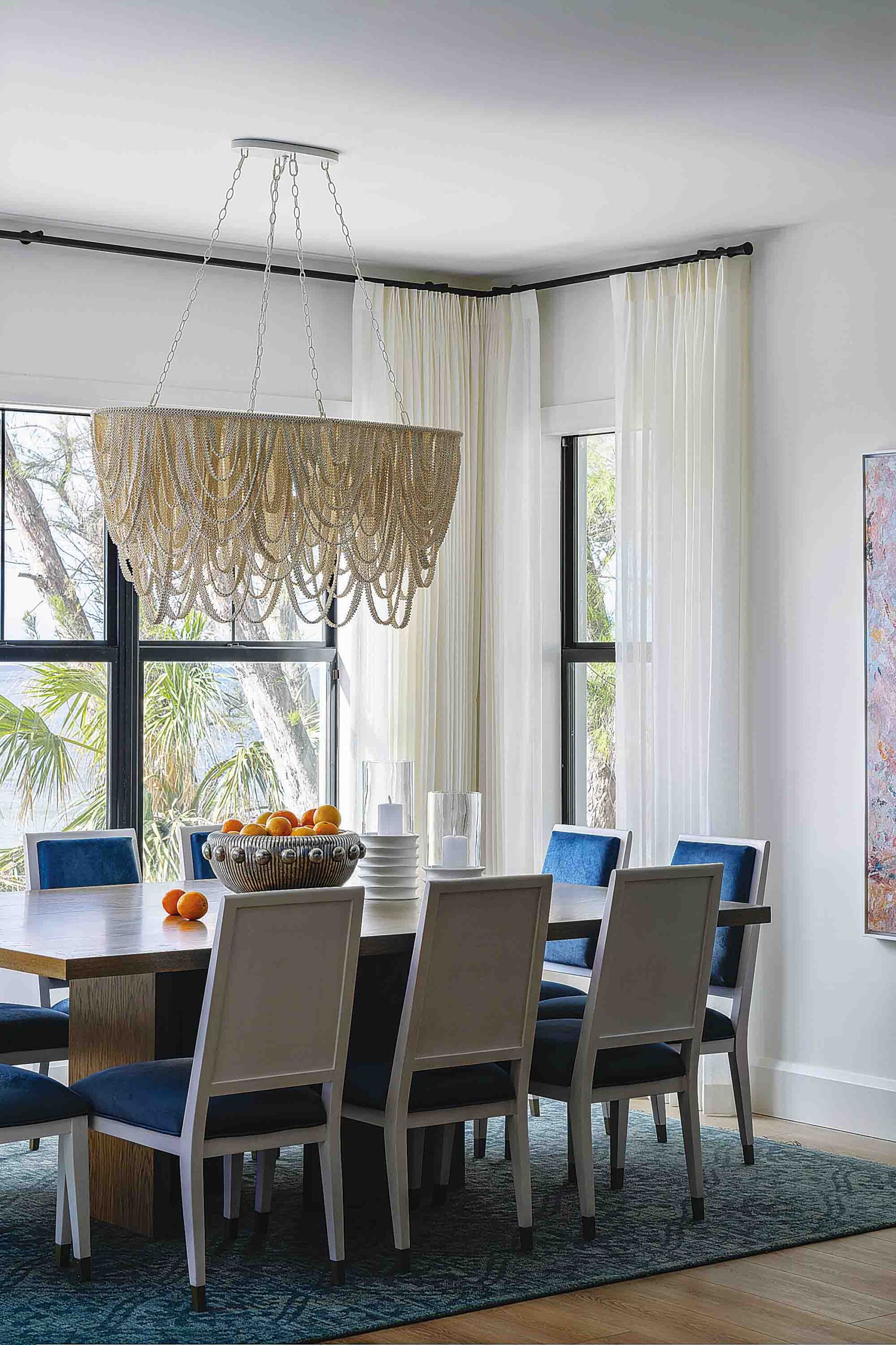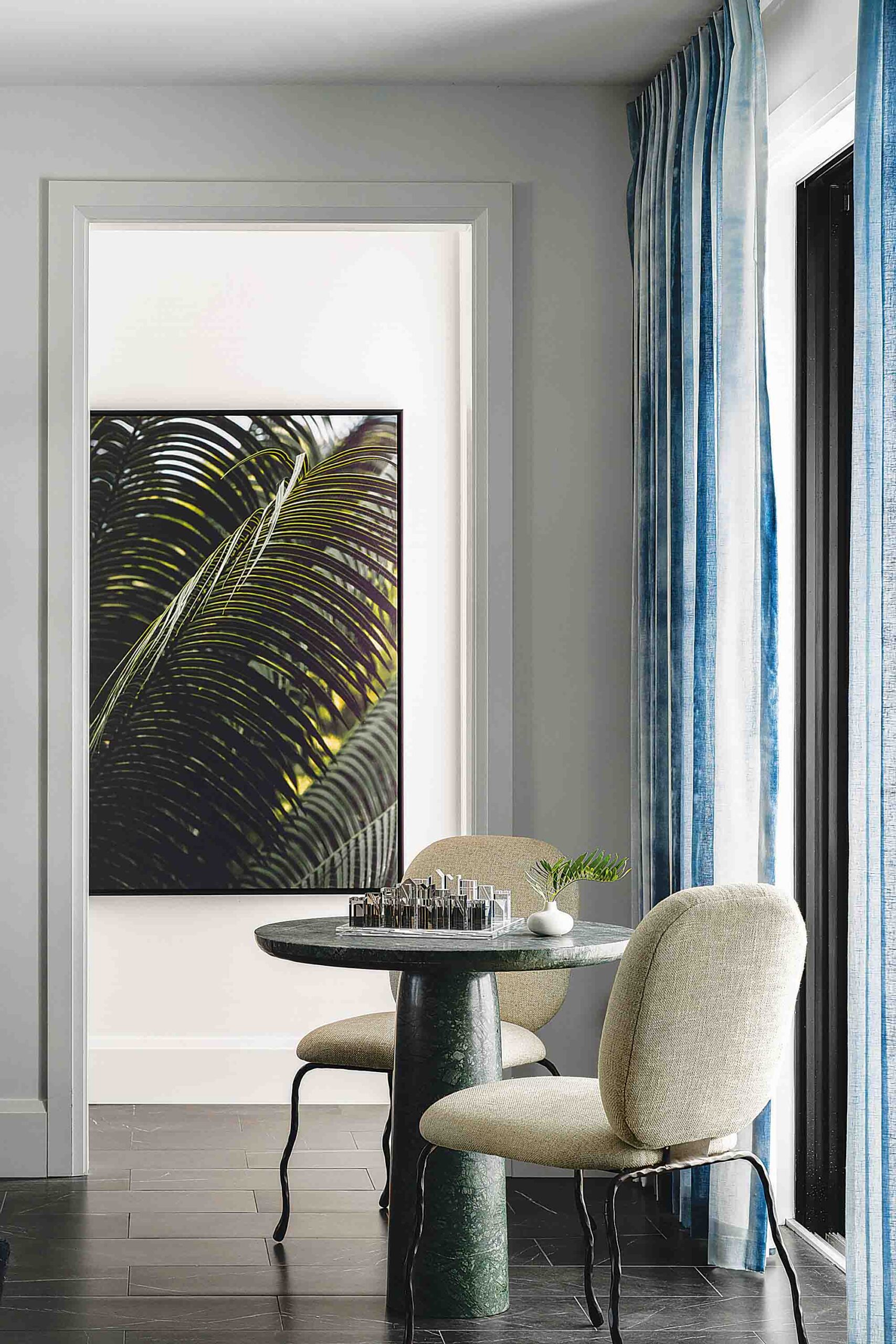 Throughout the home, bold yet balanced color choices create a lively coastal energy—while designer wallcoverings including grasscloth, tropical botanicals, geometric patterns and wave-inspired prints add personality to every room.