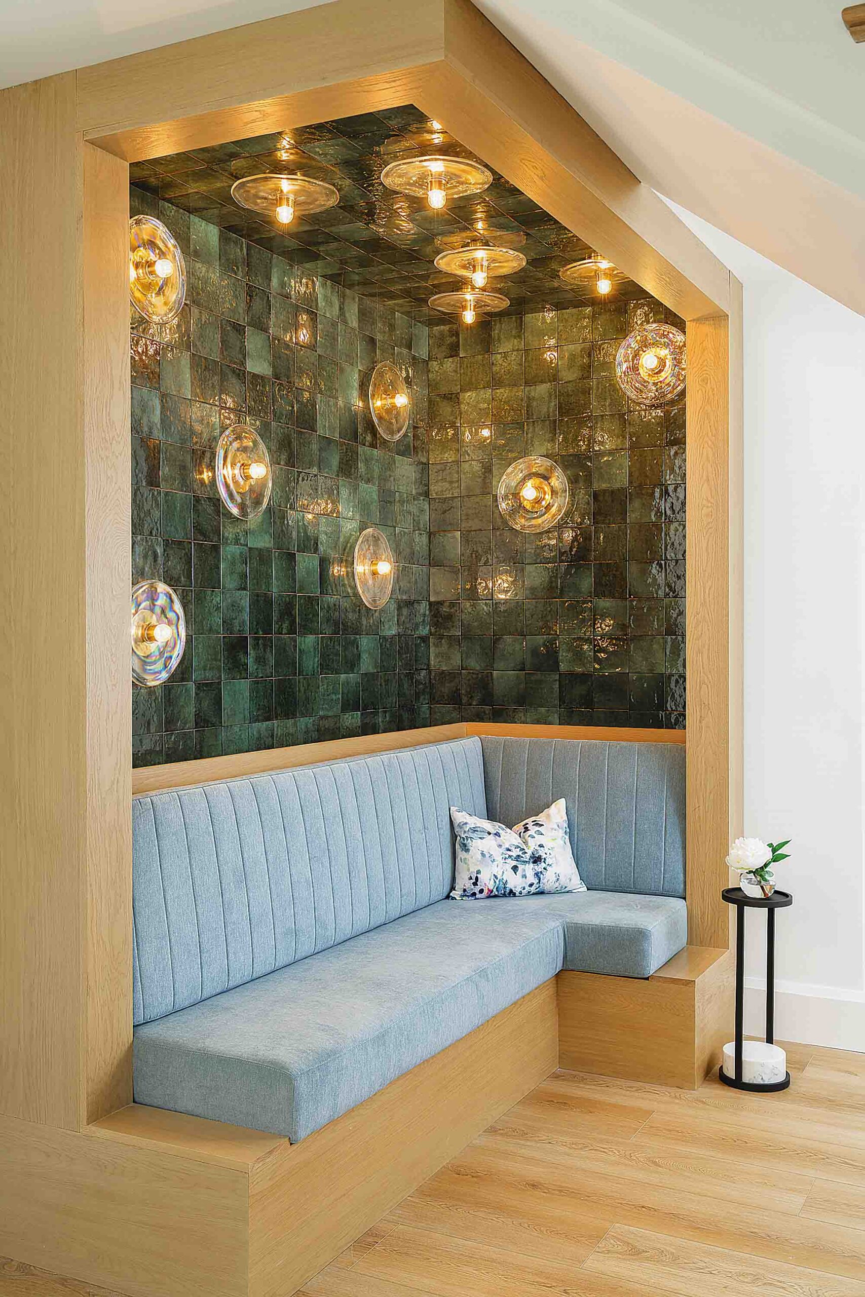 A standout feature in the home is the custom bunk room, which sleeps six and channels a playful treehouse vibe. The space is wrapped in a white-and-green botanical wallcovering with bright millwork, fabrics and individual sconce reading lights in each bunk. Two unique amenities—a selfie station and glam station—turn functional spaces into memorable experiences. The ground-level selfie station features custom tilework, integrated seating, layered lighting, a full-length mirror and a built-in ring light for picture-perfect moments. The glam station, designed for weddings and events, includes custom cabinetry, LED lighting, stone countertops and built-in mirrors. Durable, high-end finishes such as full masonry construction, natural quartzite, large-format porcelain tile and custom cabinetry by Londos Fine Cabinetry ensure the home’s longevity in its coastal environment.