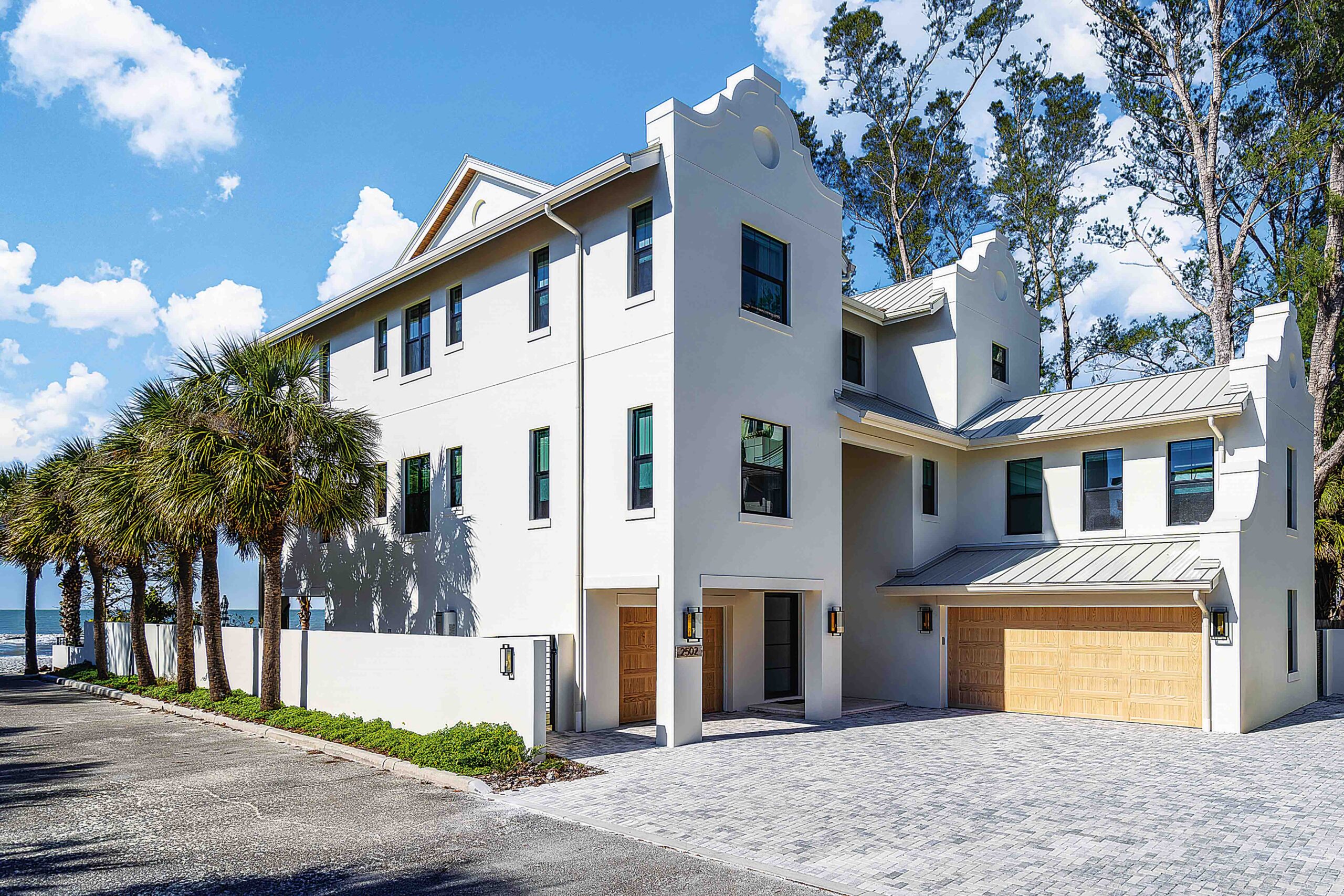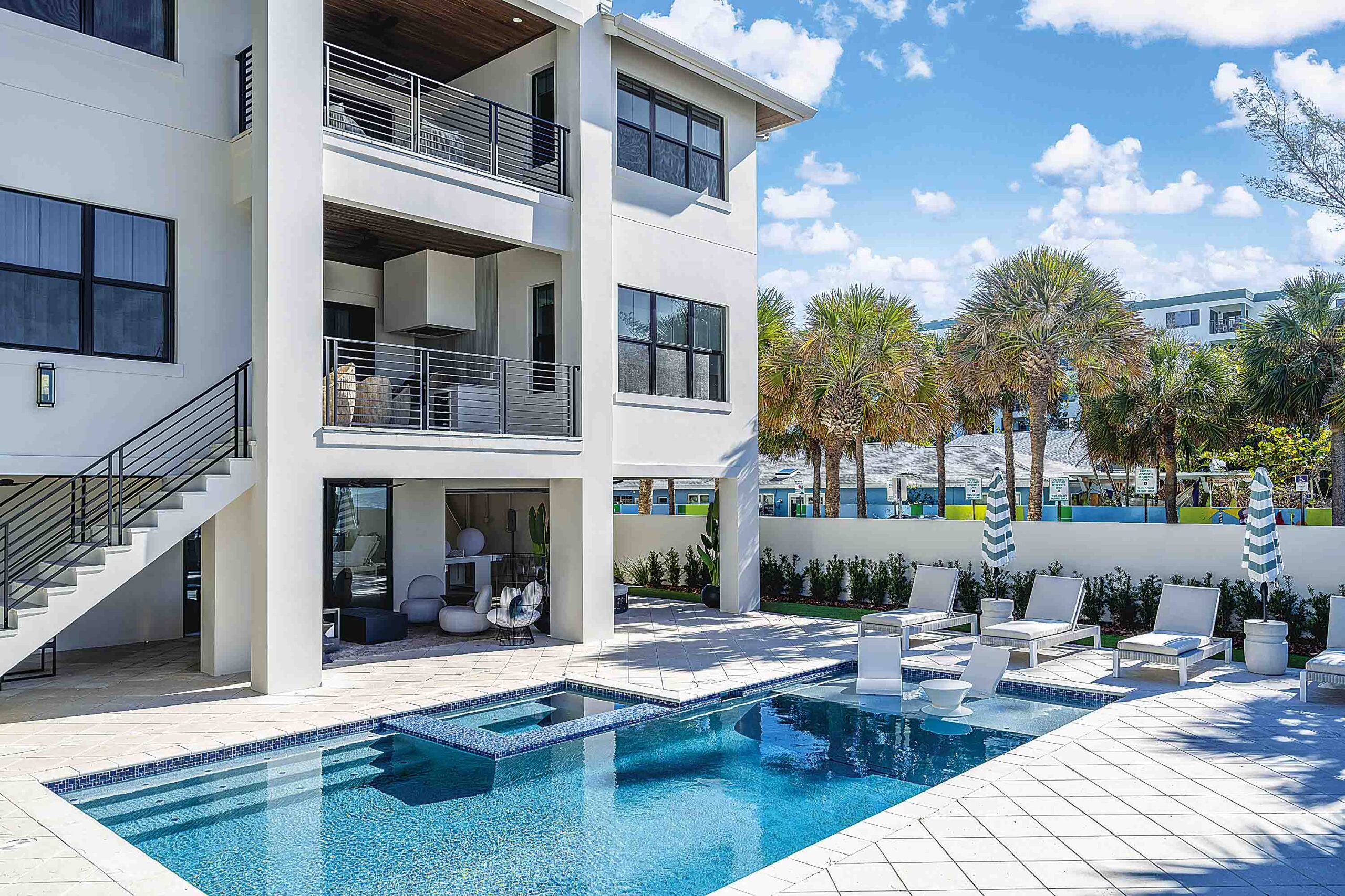 Located directly on the waterfront at Indian Rocks Beach, this three-story home was designed to deliver a high-end rental experience that comfortably accommodates large groups. The exterior blends traditional coastal architecture with subtle British West Indies influences, while the interiors channel the nostalgic charm of vintage Florida road trips.