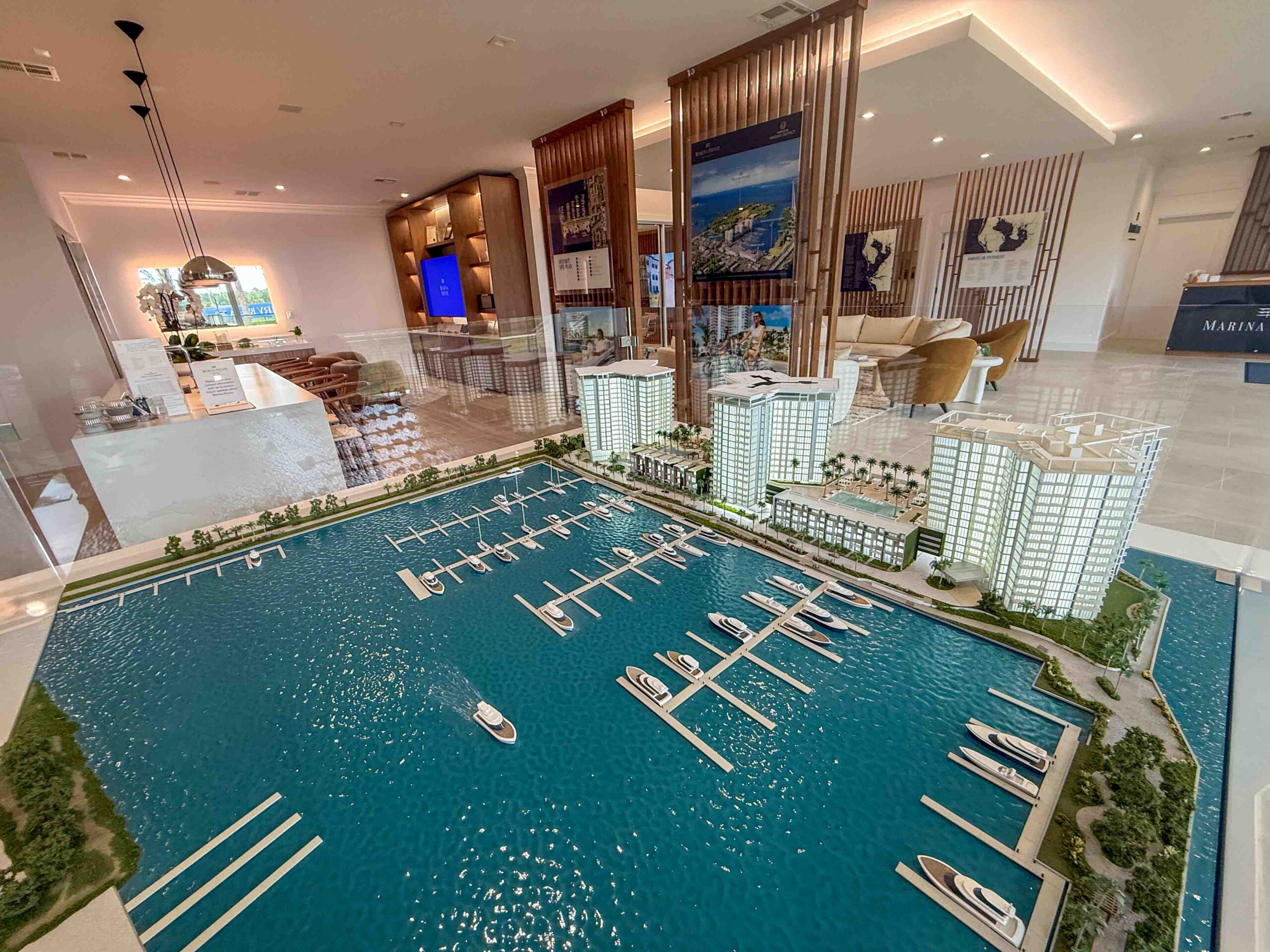 Visitors to the Marina Pointe Sales Gallery can explore a detailed scale model illustrating the community’s waterfront towers and private marina.
