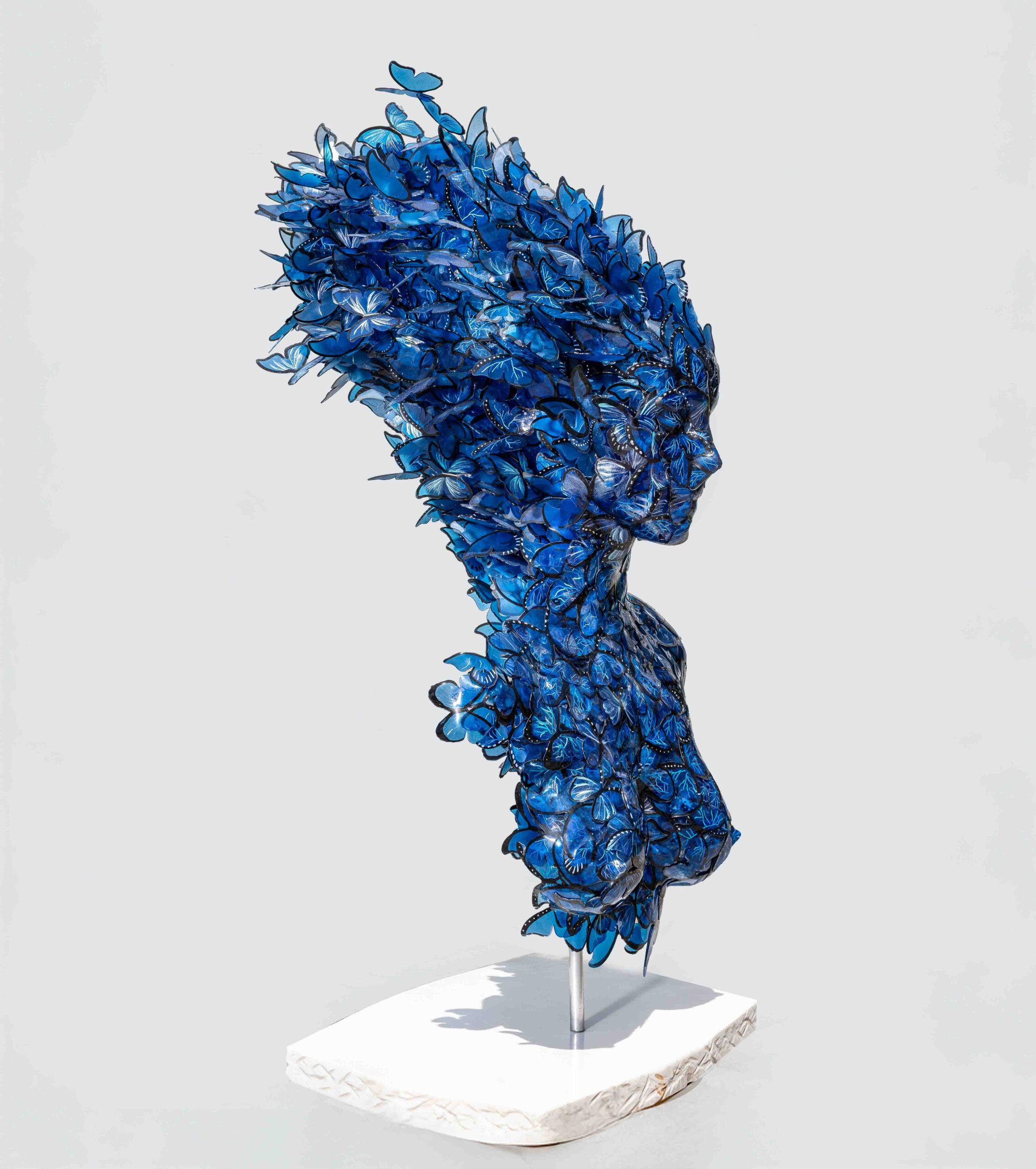 “This cornflower blue acrylic butterfly sculpture was born out of some of the hardest times my daughter and I faced together,” Parker says. “It’s made up of hundreds of individually painted and shaped butterflies that come together to form a human figure. For me, it represents that moment when fear and loss finally gave way to understanding and growth.”
