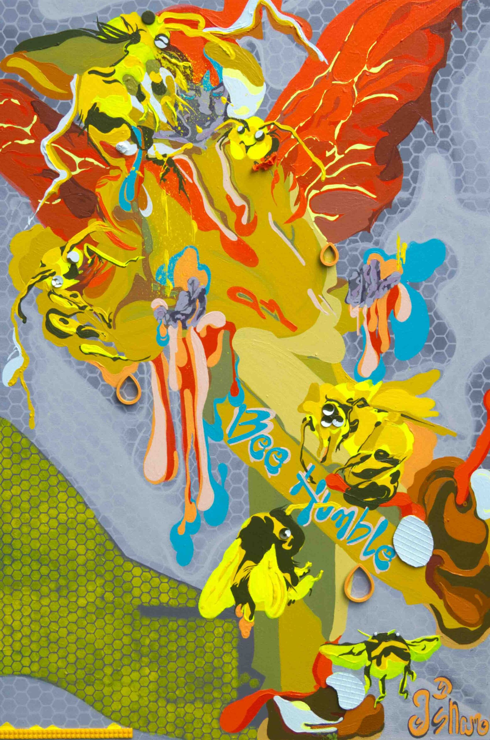 ”HumbleBee” by Tricia Sham. Tampa-based artist Tricia Sham creates abstract figurative and surrealist works that explore connections between insect behavior and human emotion. This piece incorporates acrylic, LEGO, metal and rubber on a cradled wood panel.