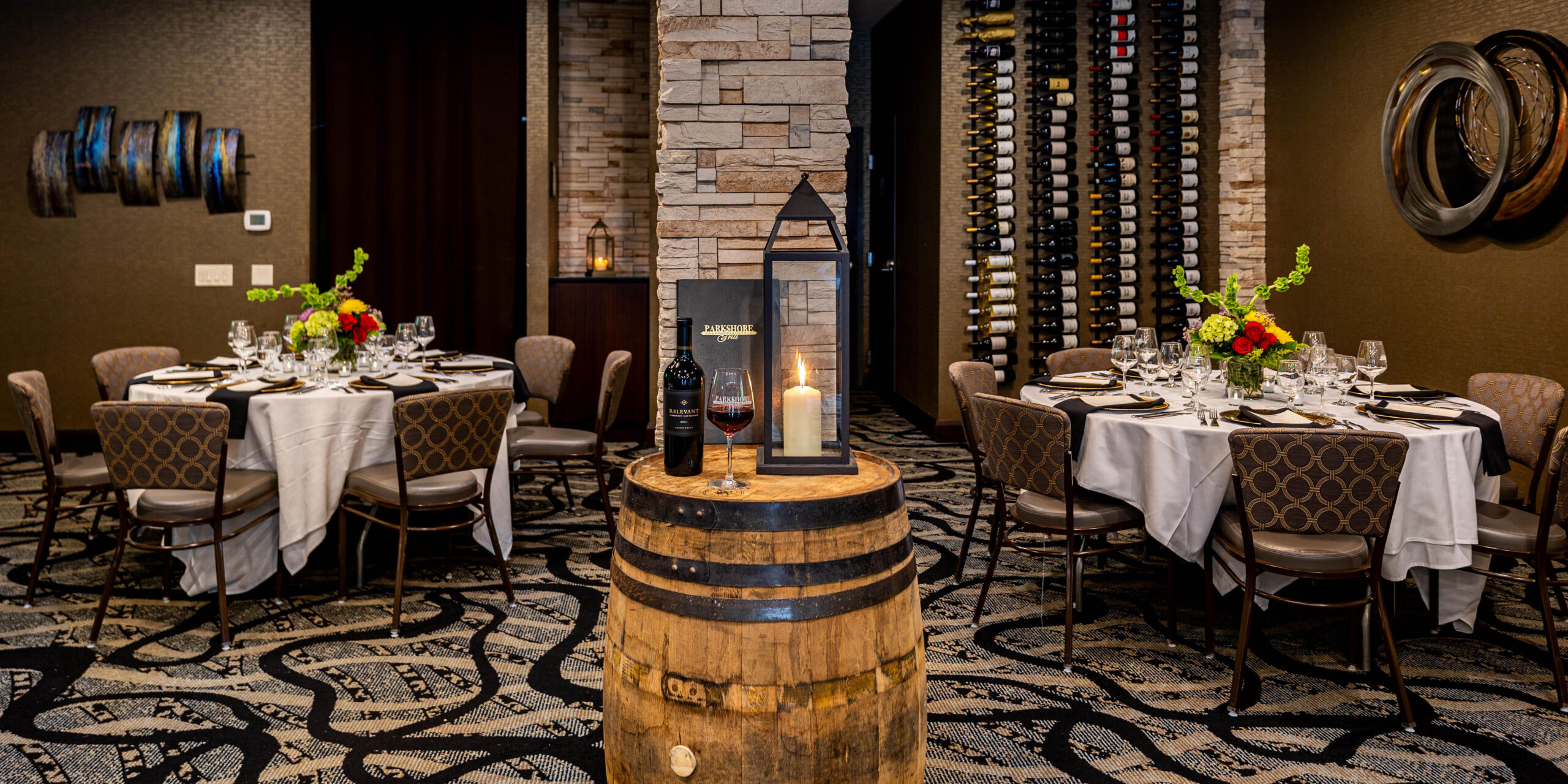 Parkshore Grill also serves as an elegant setting for private events, from intimate celebrations to large-scale receptions. Three distinct private dining spaces offer flexibility for gatherings of all sizes. The Wine Cellar, adjacent to the main dining room, accommodates up to 64 seated guests or 100 for a standing reception. For a scenic outdoor option, The Alcove provides a secluded, covered space with access to both the wine room and main dining room, hosting up to 30 seated guests or 70 standing. The most intimate setting, The Back Room, is ideal for bridal or baby showers or private board dinners and comfortably seats 16 guests.