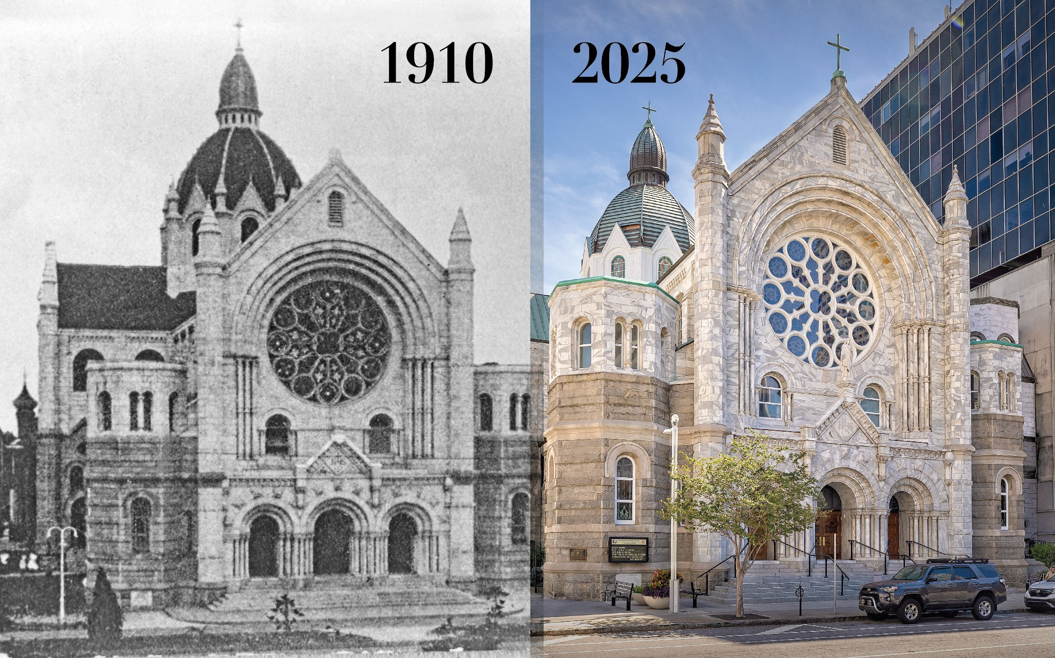 Now: The church building, designed in the Romanesque style and adorned with granite and marble, still stands largely unchanged. The 70 stained glass windows were all made in Munich, Germany, by Franz Mayer Co. and are original to the building. In addition to the church, the property was home to a boys’ school, operating from 1899 until 1956.