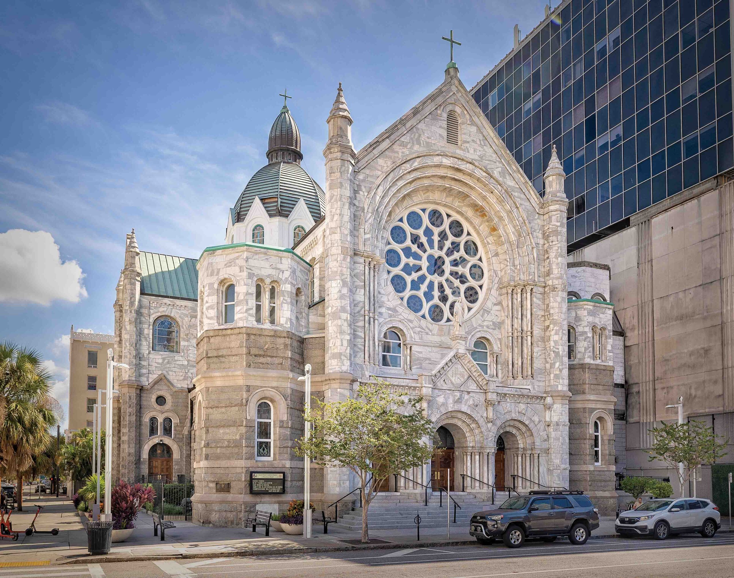 Then: Tampa’s first Catholic Church, St. Louis Parish, was established in 1859 on Florida Avenue and Twiggs Street. That wood-frame structure served the needs of Tampa’s small Catholic population until the growth brought by the arrival of Henry Plant’s railroad and the founding of the cigar industry in the 1880s. On February 16, 1898, ground was broken for a new, grand church. That building, named Sacred Heart, was dedicated on January 15, 1905. This photo shows the new church along with the original, though expanded, St. Louis Parish to the right.